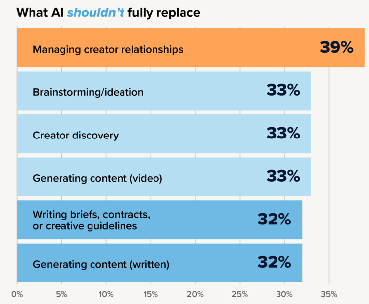 While there are many insightful learnings about AI throughout the report—I could write a whole blog post on it, but again, I won’t—I want to focus on what creator marketers said they would keep analogue for the time being. Creators themselves also gave a fascinating response to this question, but I can’t give away the game, now can I? You do still have to download the report after this, you know.