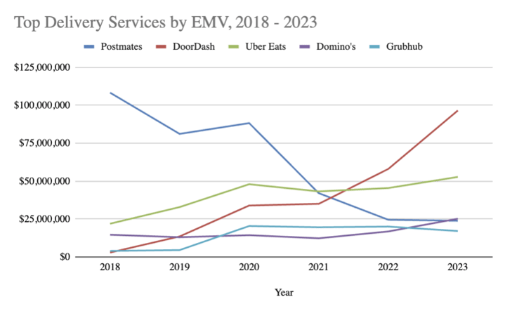 On its own, DoorDash’s EMV growth is pretty impressive. The brand has surged all the way from $2.9M EMV in 2018 to $96.6M EMV in 2023, an improvement of over 3000%. It wins the aesthetically pleasing distinction of increasing its EMV every year from then till now, and even more impressively, continued growing after COVID boosted the social relevance of delivery services.