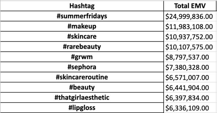 But what I didn’t expect was how ubiquitous #RareBeauty would be for other brands. I haven’t seen such a thing since the Glory Days of Anastasia Beverly Hills, but #RareBeauty has become such a common and viral tag in the Beauty world that it’s ranking as a Top 10 EMV-driving hashtags for other brands.
